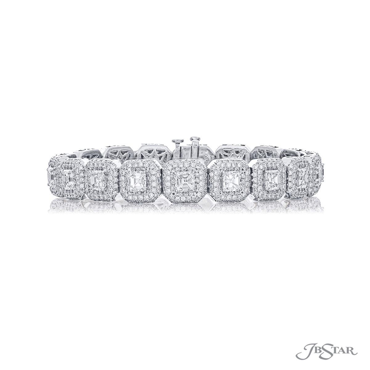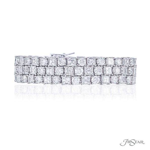 Magnificent diamond bracelet featuring 3 rows of square emerald-cut and round diamonds in a shared prong setting. Handcrafted in pure platinum.