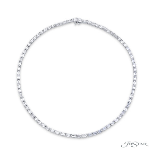 One-of-a-kind Beauty: Our stunning 26.22 ctw. Diamond Necklace. These seventy-four emerald-cut diamonds are handcrafted in pure platinum.