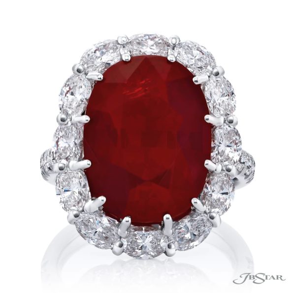 Breathtaking Radiance: Our one-of-a-kind 11.78 ct. certified Burmese Ruby Ring. This magnificent oval Burmese ruby crowned in dazzling oval and round diamonds is handcrafted in pure platinum.