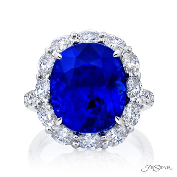 Breathtaking Radiance: Our one-of-a-kind 13.05 ct. certified Burmese Sapphire Ring. This magnificent no-heat oval Burmese sapphire crowned in dazzling oval and round diamonds is handcrafted in pure platinum.