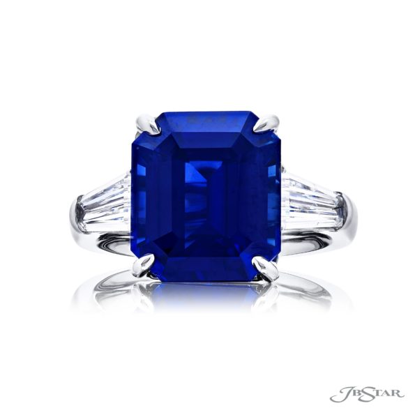 Breathtaking Radiance: Our stunning Sapphire center and diamond ring featuring a 10.03 ct. certified square emerald-cut sapphire center embraced by two tapered baguettes diamonds. Handcrafted in pure platinum.