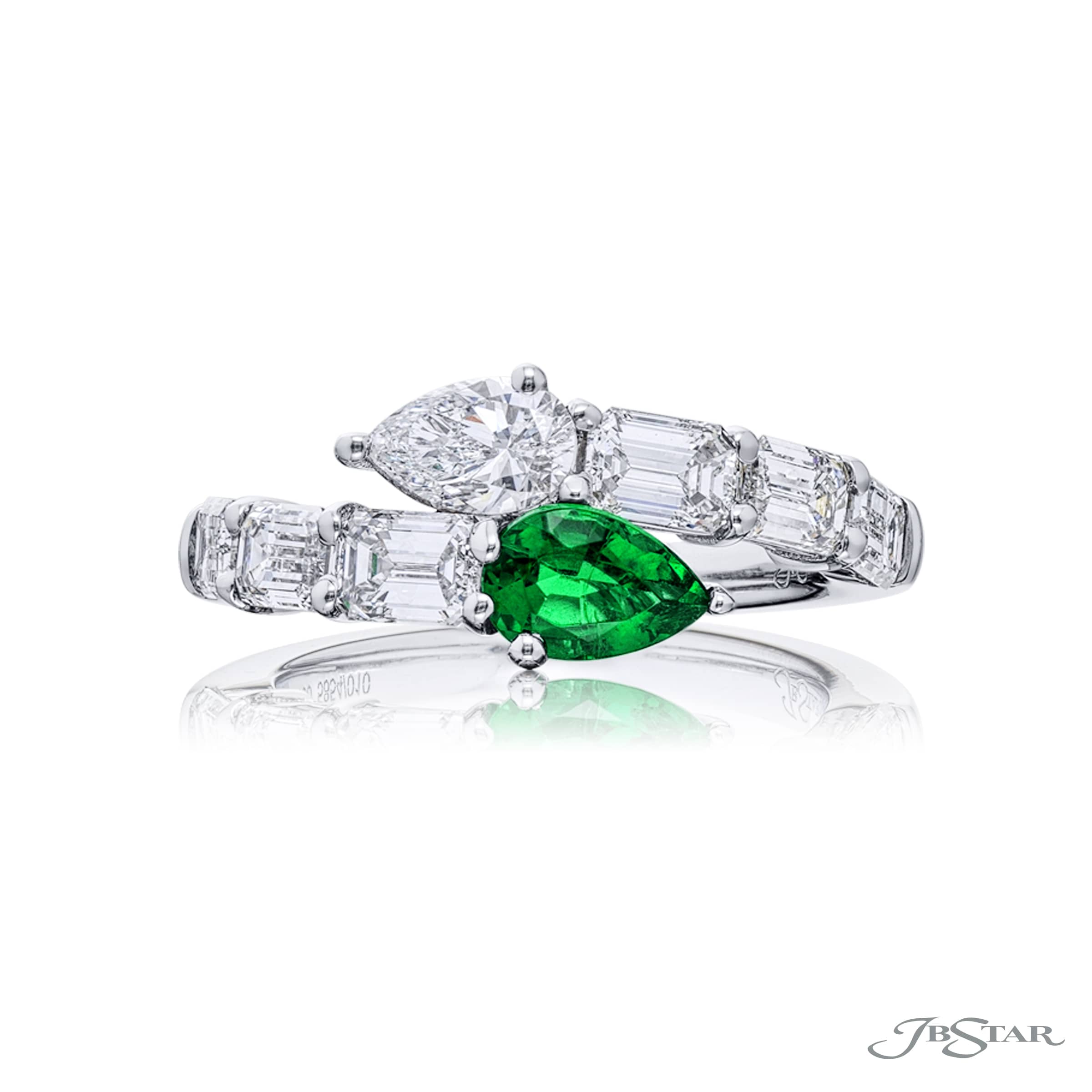 Breathtaking Radiance: Our stunning 6.11 ct. certified Colombian Emerald Ring. This beautiful vivid cushion-cut emerald embraced by half-moon diamonds is handcrafted in pure platinum.