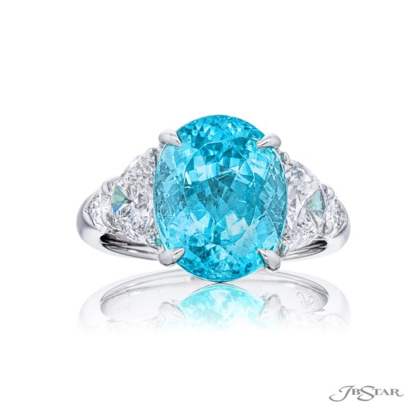 Breathtaking Radiance: Our stunning 5.54 ct Paraiba Ring. This beautiful oval paraiba flanked by half-moon and shield diamonds is handcrafted in pure platinum.