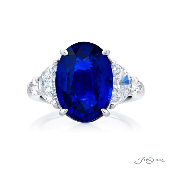 Breathtaking Radiance: Our magnificent 10.03 ct. certified Sri Lankan Sapphire Ring. This stunning oval sapphire flanked by shield and half-moon diamonds is handcrafted in pure platinum.