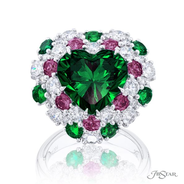 Breathtaking Radiance: Our stunning emerald and diamond ring featuring a 5.76 ct.certified heart-shaped emerald center encircled by round diamonds emeralds and pink sapphires. Handcrafted in pure platinum.