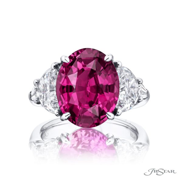 Breathtaking Radiance: Our magnificent 11.06ct. certified Pink Sapphire Ring. This stunning oval pink sapphire flanked by half-moon and tapered baguette diamonds is handcrafted in pure platinum.