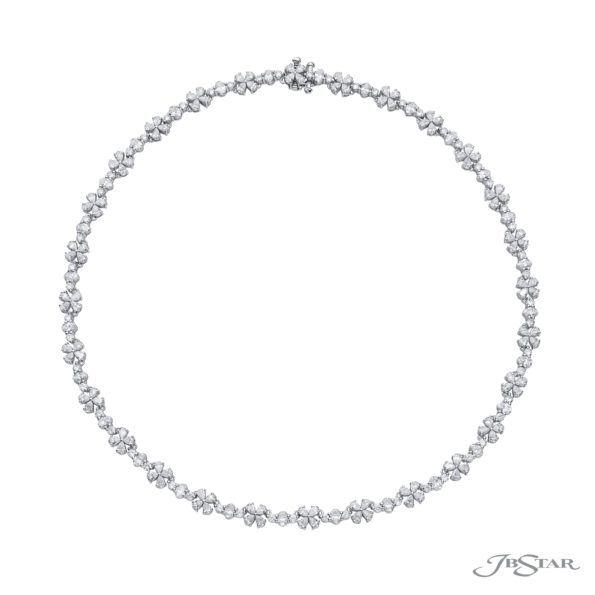 One-of-a-kind Beauty: Our stunning diamond necklace. These exquisite pear-shaped diamonds in a floral design are accompanied by oval and round-cut diamonds in an alternating display handcrafted in pure platinum.