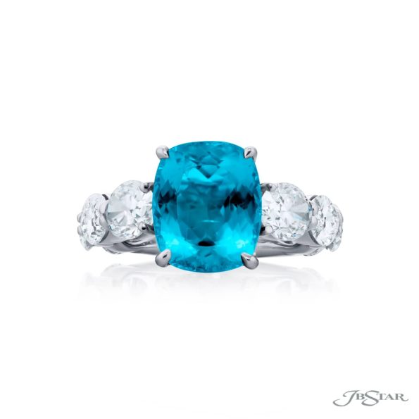 Breathtaking Radiance: Our beautiful 4.23 ct. certified Paraiba Ring. This stunning cushion-cut paraiba flanked by dazzling oval diamonds is handcrafted in pure platinum.