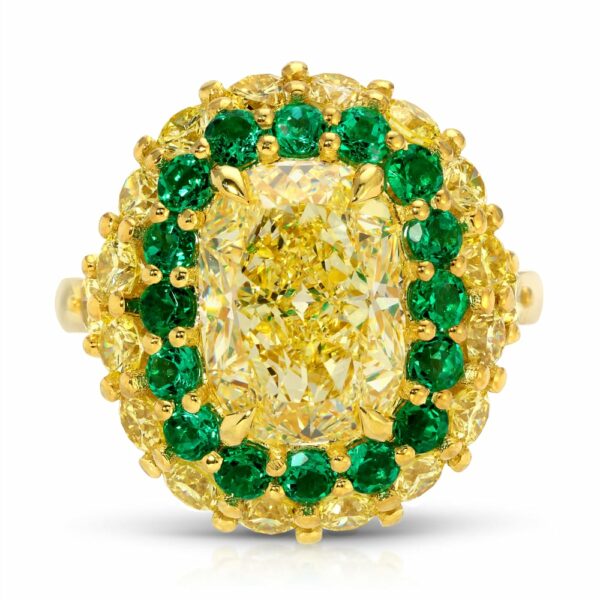Cushion Cut Fancy Yellow Diamond and Green Emerald Halo Ring