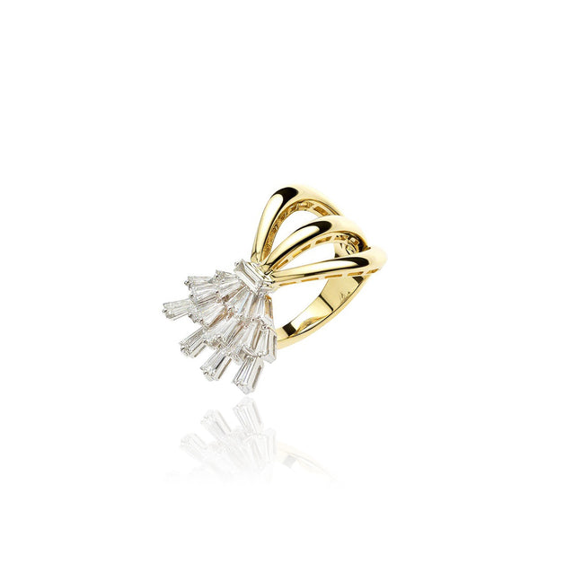 YEPREM stackable ring adorned with a combination of baguette and tappers diamonds, boasting exceptional clarity of VVS and VS, as well as a striking F-G color. Baguette Diamond: 0.11 ct Tappers Diamond: 1.42 ct Stone Quantity: 19 Total Weight: 14.59 g The size can be adjusted to perfectly fit any finger. Kindly contact us to meet your inquiries.