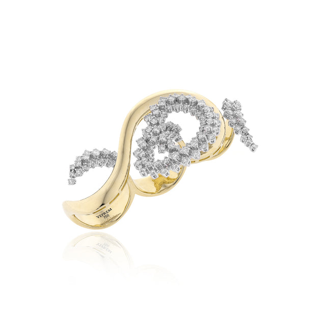 YEPREM triple finger statement ring adorned with round diamonds, boasting exceptional clarity of VVS and VS, as well as a striking F-G color. Round Diamond: 3.37 ct Stone Quantity: 131 Total Weight: 33.13 g The size can be adjusted to perfectly fit any finger. Kindly contact us to meet your inquiries.