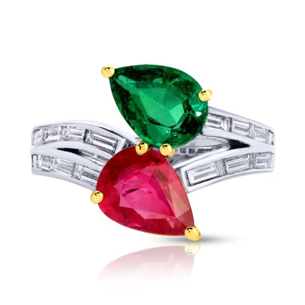 Pear Shape Ruby and Green Emerald Diamond Bypass Ring