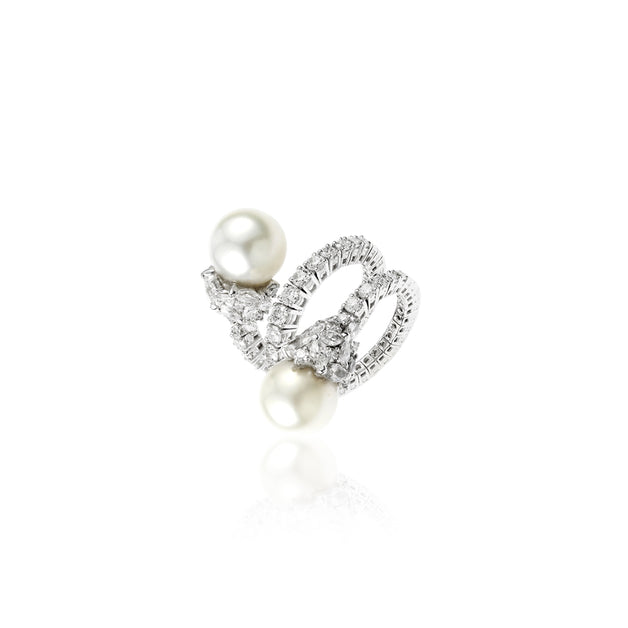 YEPREM stackable ring adorned with a combination of round and marquise diamonds boasting exceptional clarity of VVS and VS, as well as a striking F-G color, perfectly accentuating the pearls. Round Diamond: 1.69 ct Marquise Diamond: 1.83 ct Pearl: 2 Stone Quantity: 67 Total Weight: 16.47 g The size can be adjusted to perfectly fit any finger. Kindly contact us to meet your inquiries.