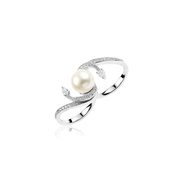 YEPREM statement double finger ring adorned with a combination of round and pear diamonds boasting exceptional clarity of VVS and VS, as well as a striking F-G color, perfectly accentuating the pearl. Round Diamond: 0.52 ct Pear Diamond: 0.22 ct Pearl: 1 Stone Quantity: 52 Total Weight: 12.47 g The size can be adjusted to perfectly fit any finger. Kindly contact us to meet your inquiries.