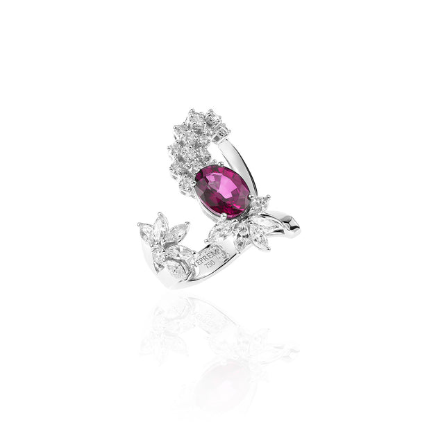 YEPREM stackable ring adorned with a combination of round and marquise diamonds boasting exceptional clarity of VVS and VS, as well as a striking F-G color, accentuating the sapphire stone. Round Diamond: 0.58 ct Marquise Diamond: 0.85 ct Pink Sapphire: 1.06 ct Stone Quantity: 30 Total Weight: 8.89 g The size can be adjusted to perfectly fit any finger. Kindly contact us to meet your inquiries.