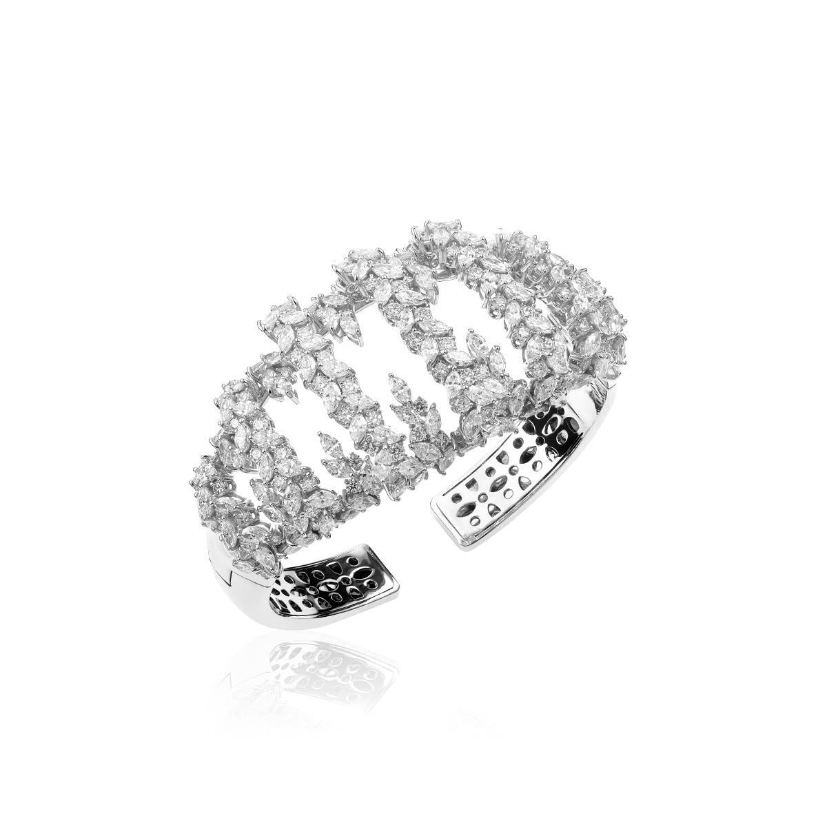 YEPREM bracelet adorned with a combination of round and marquise diamonds boasting exceptional clarity of VVS and VS, as well as a striking F-G color. Round Diamond: 4.28 ctMarquise Diamond: 11.67 ctStone Quantity: 302Total Weight: 68.43 g The size can be adjusted to perfectly fit any wrist. Kindly contact us to meet your inquiries.