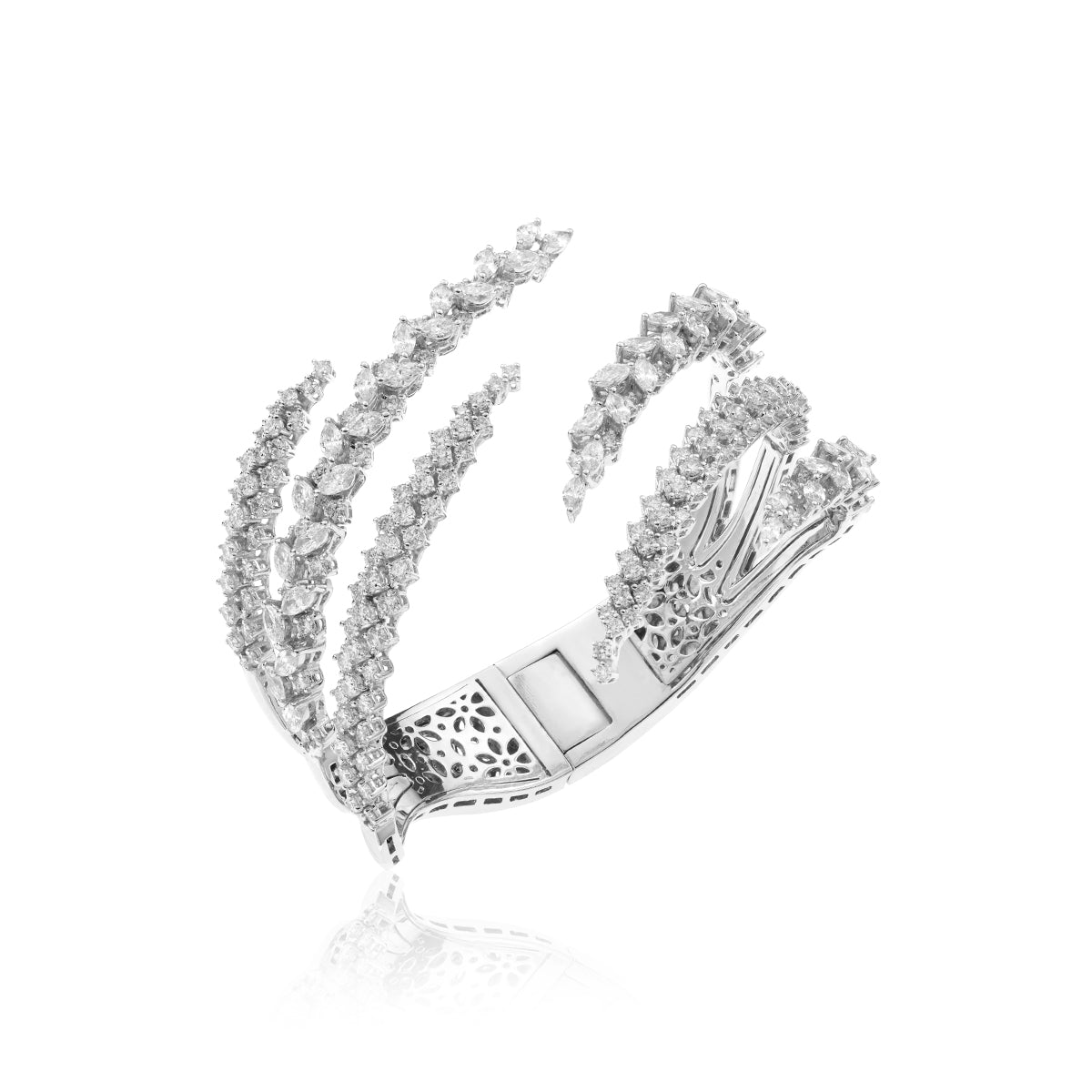 YEPREM bangle bracelet adorned with both round and marquise diamonds boasting exceptional clarity of VVS and VS, as well as a striking F-G color.Round Diamond: 5.56 ctMarquise Diamond: 3.99 ctStone Quantity: 225Total Weight: 55.98 g The size can be adjusted to perfectly fit any wrist. Kindly contact us to meet your inquiries.